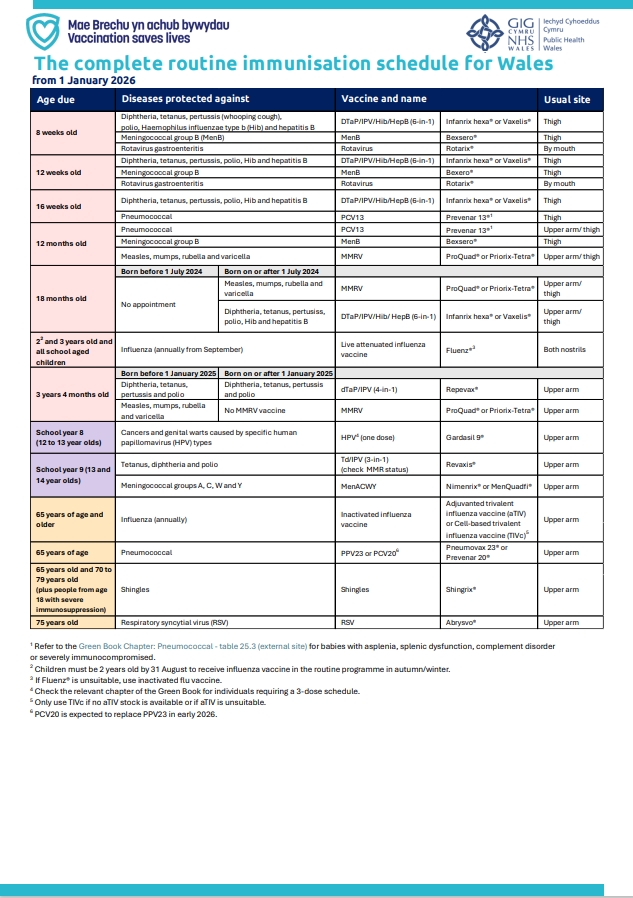 The complete routine immunisation schedule for Wales from 1 January 2026.jpeg 271KB 633x898 72dpi sRGB Asset Code: IMM218_digital Asset Category: #DigitalVersion Digital Assets The complete routine immunisation schedule for Wales from 1 January 2026.pdf 214KB Top