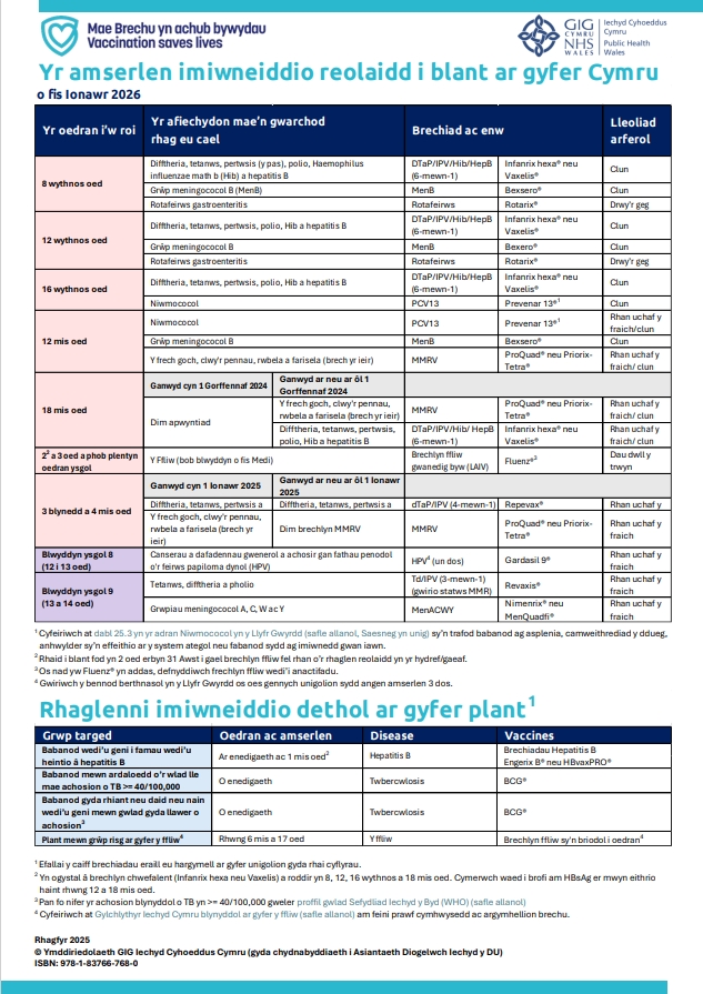 Yr amserlen imiwneiddio reolaidd i blant ar gyfer Cymru o fis Ionawr 2026.jpeg 352KB 633x895 72dpi sRGB Asset Code: IMM219_digital Asset Category: #DigitalVersion Digital Assets Yr amserlen imiwneiddio reolaidd i blant ar gyfer Cymru o fis Ionawr 2026.pdf 177KB Top